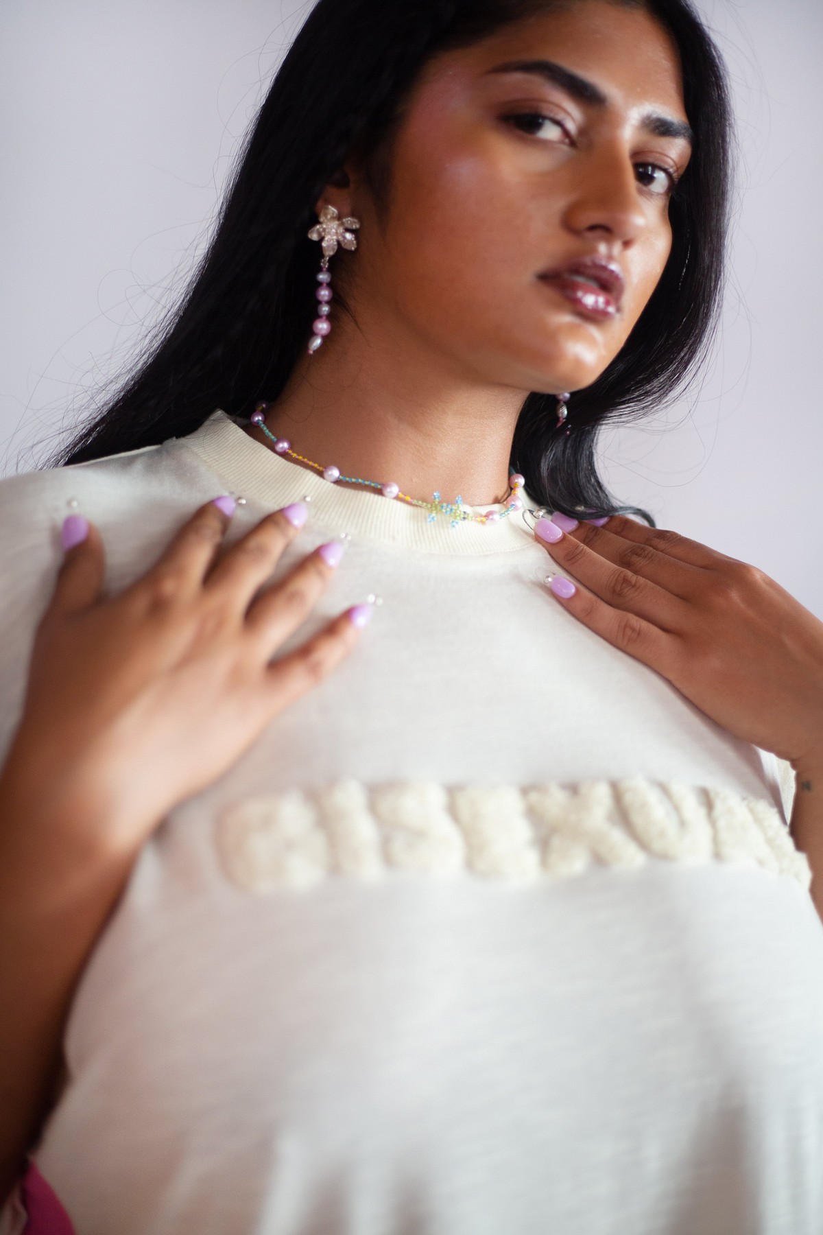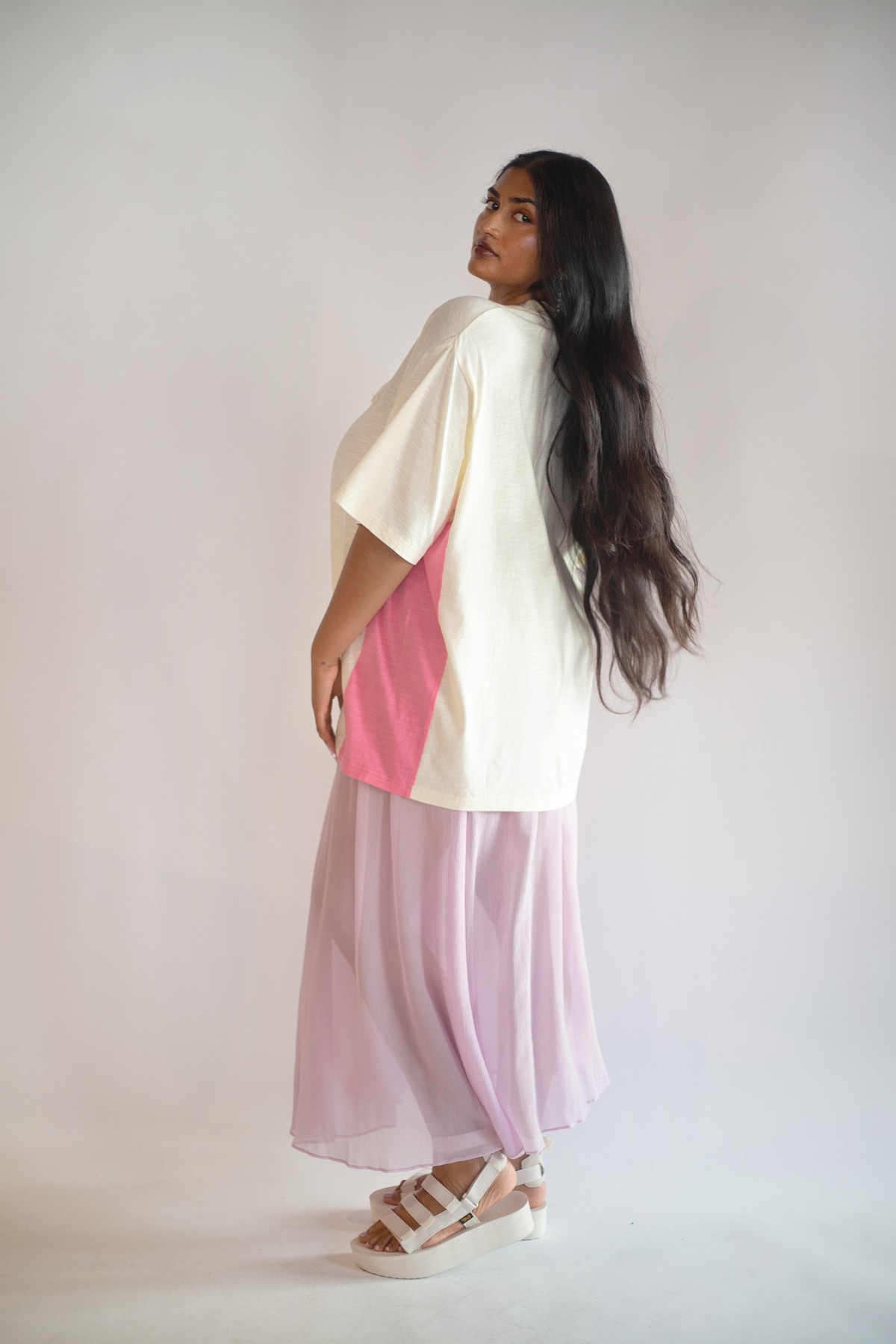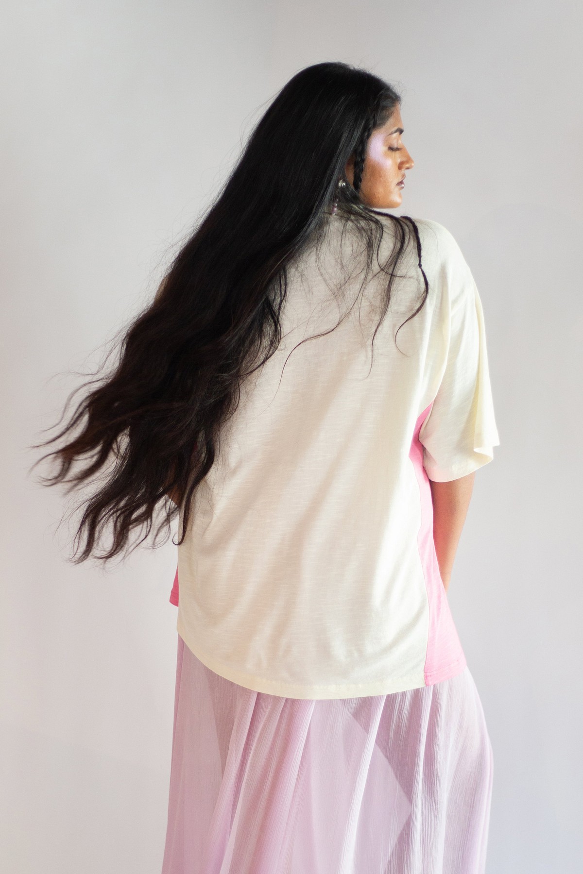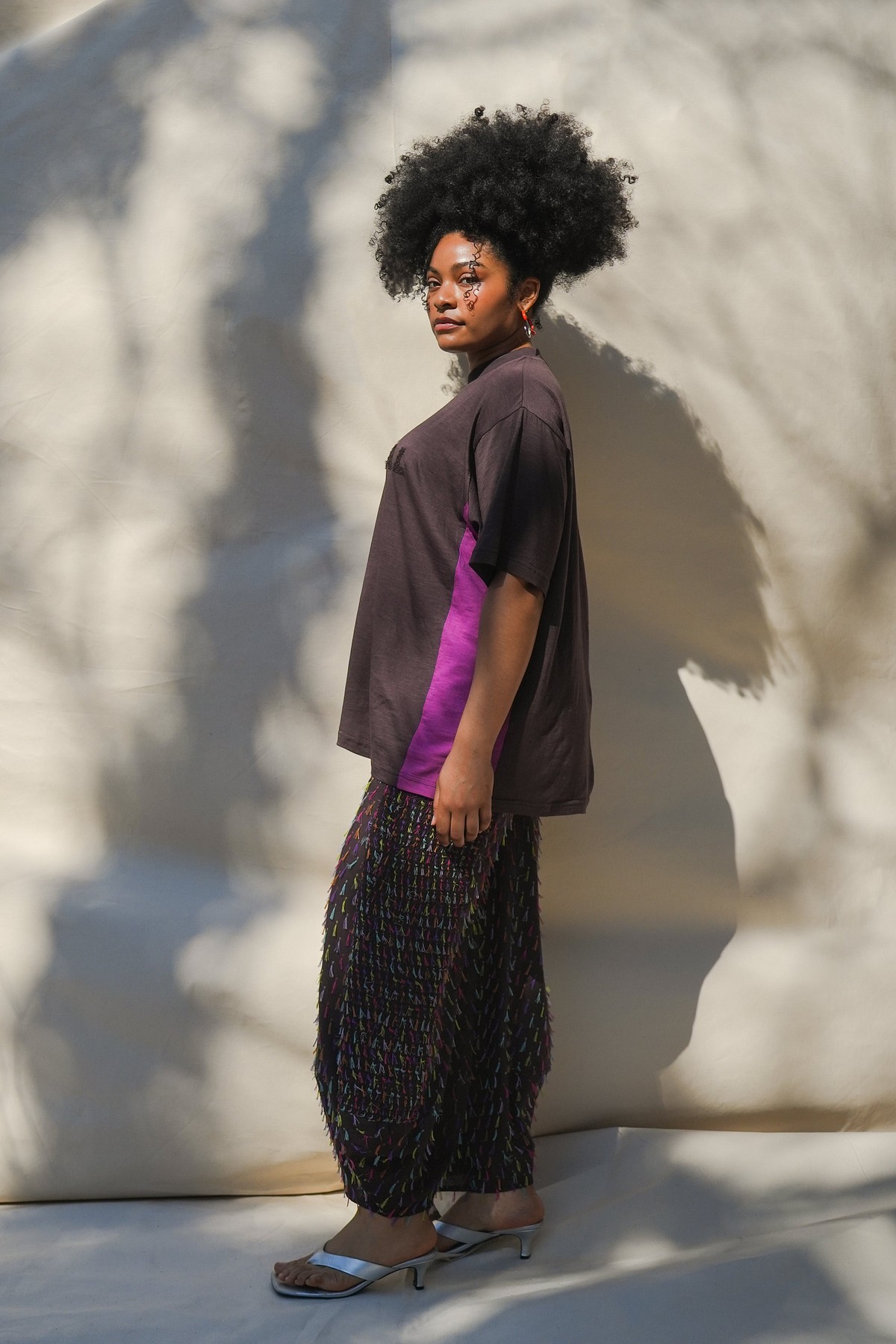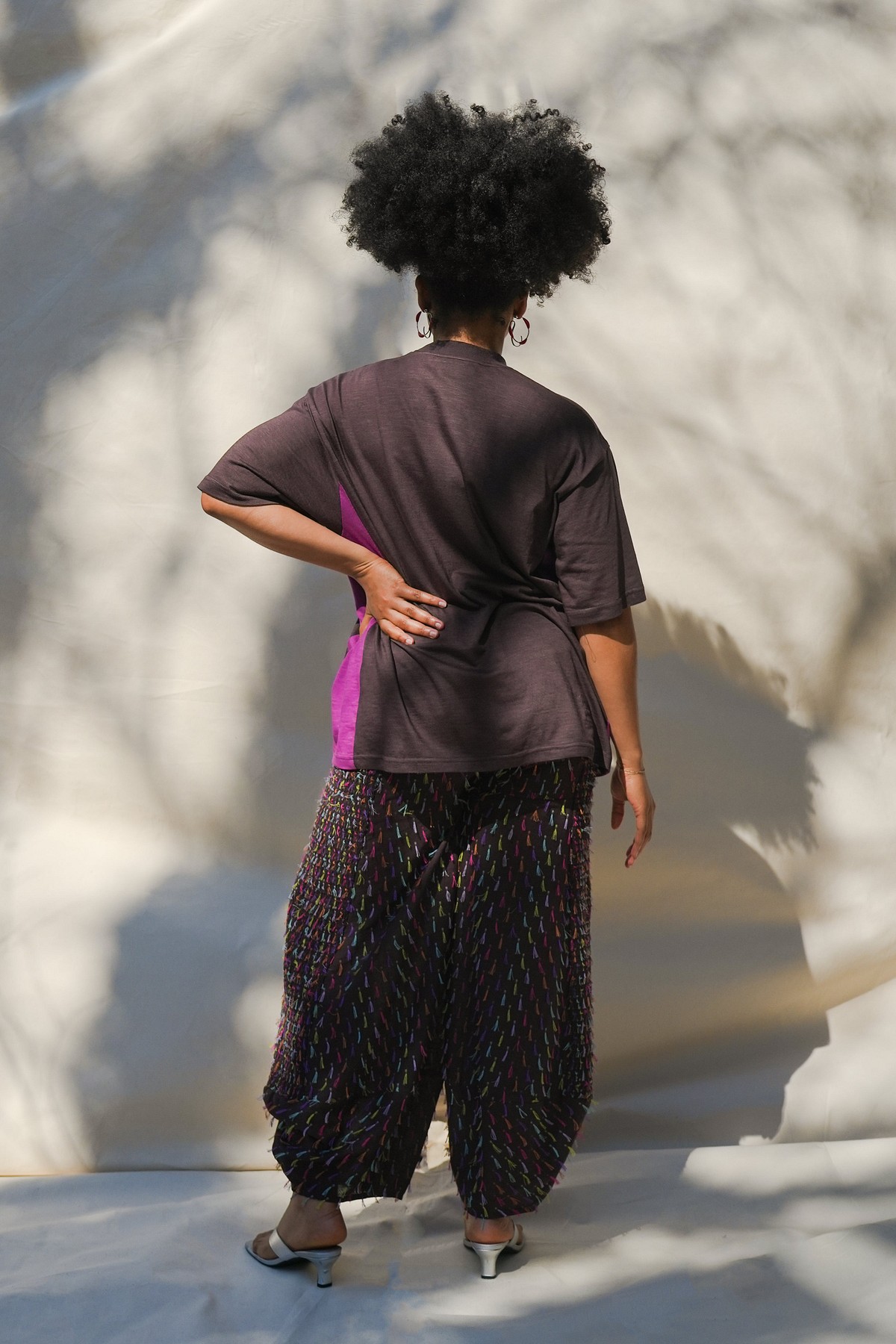 Celebrating identity has never been softer, and it’s packaged in a jersey tee hand-embroidered in New Delhi, India using the ‘ari’ technique. Contrast panels in bright tones at the sides. Pair simply with denim, or smartly with our dhoti-inspired cotton pants.