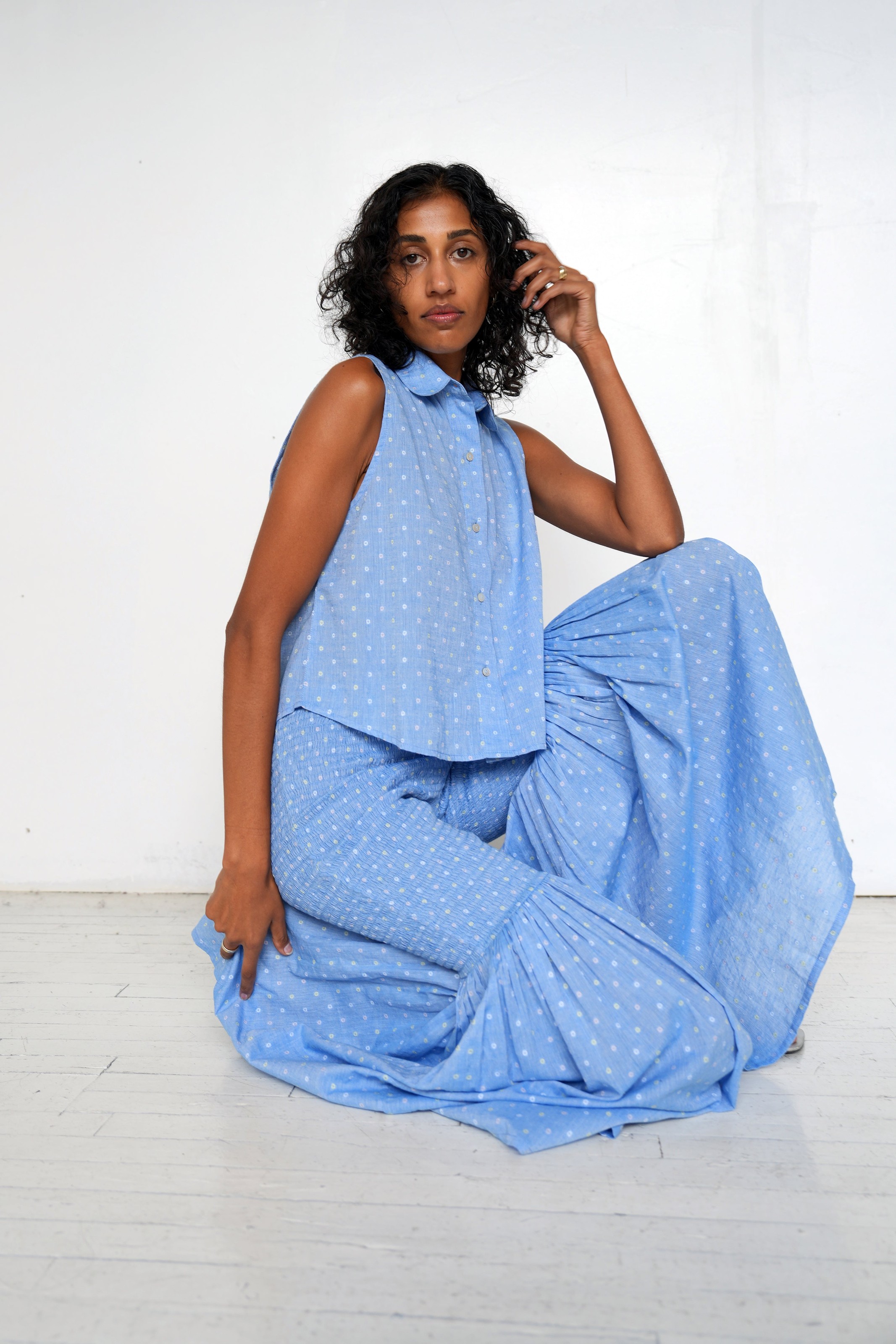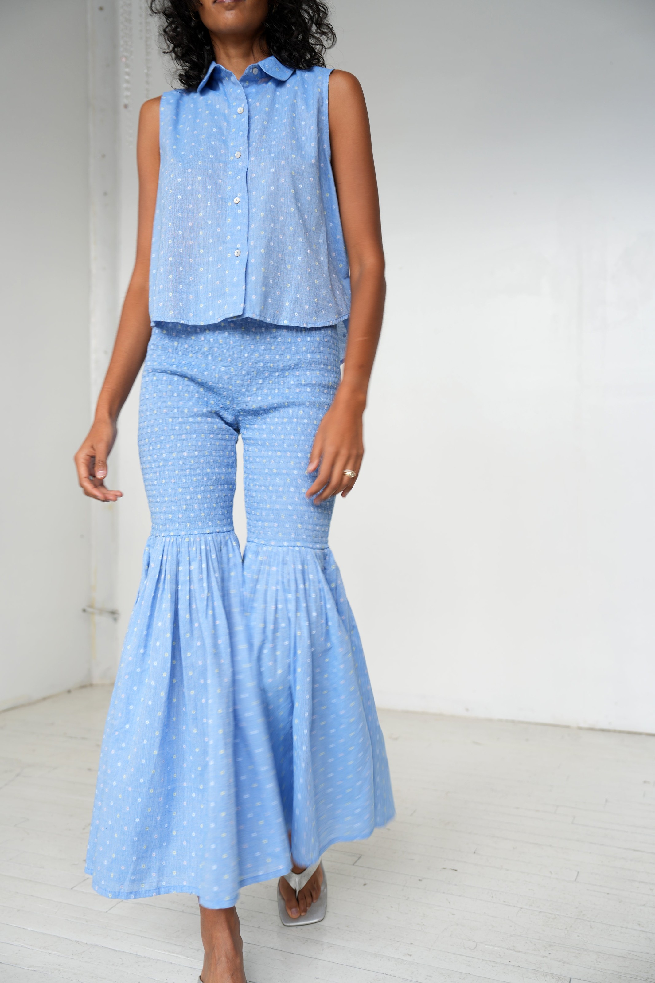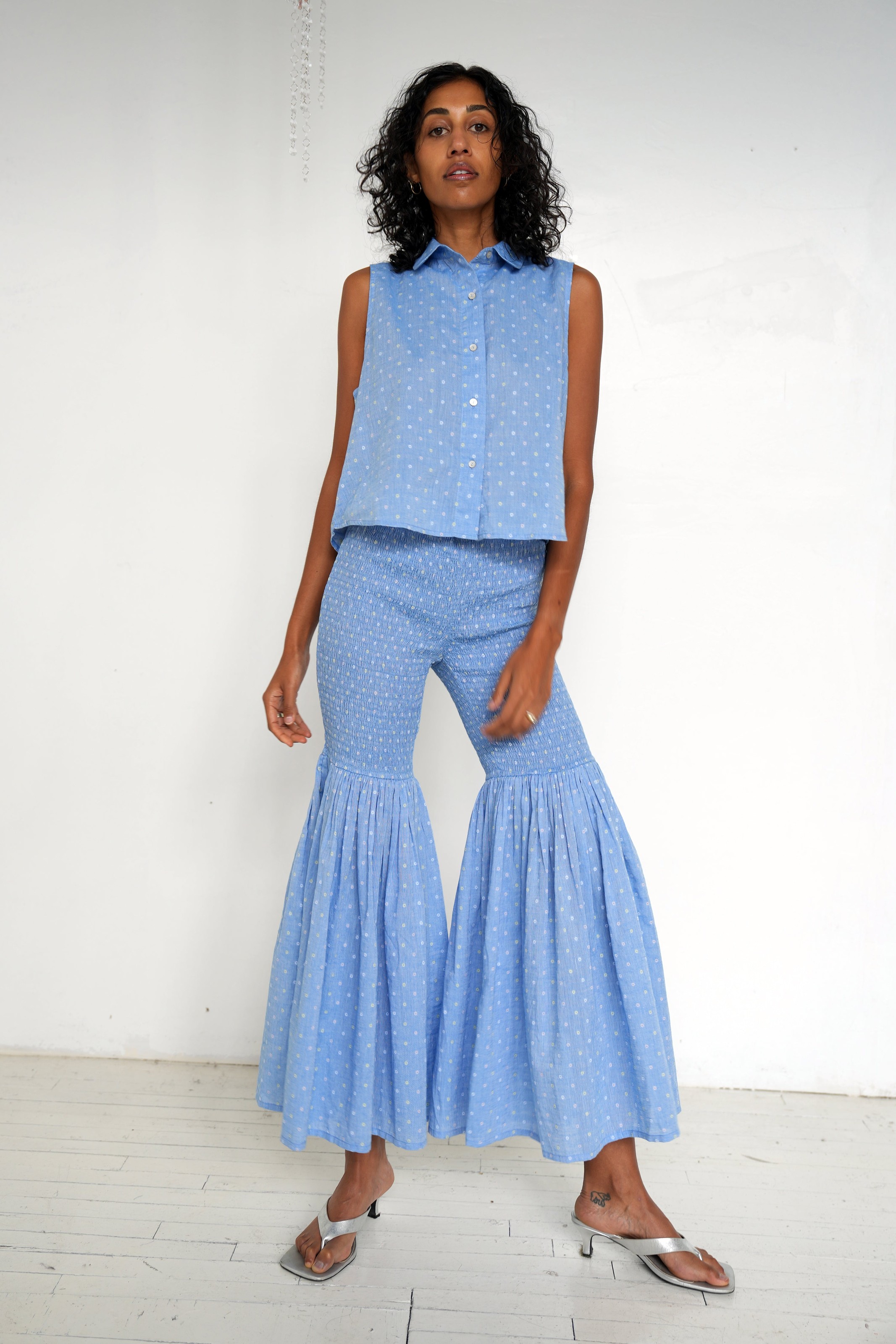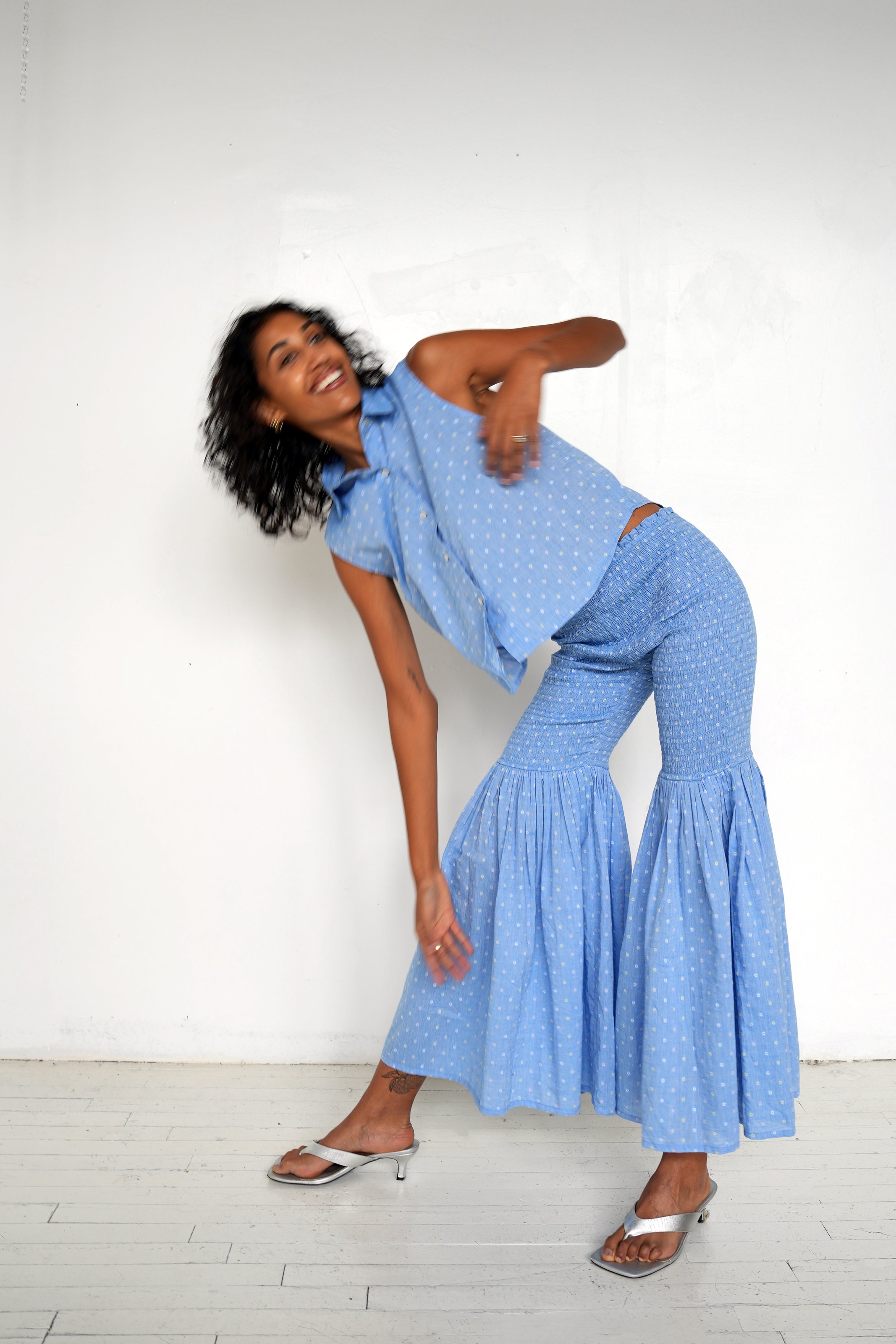 Our 'sharara' pants have elastic smocking at the hip and thighs, a tiny ruffle at the waist, and flared flounces on the legs. Inspired by the traditional sharara or gharara pant from South Asia.