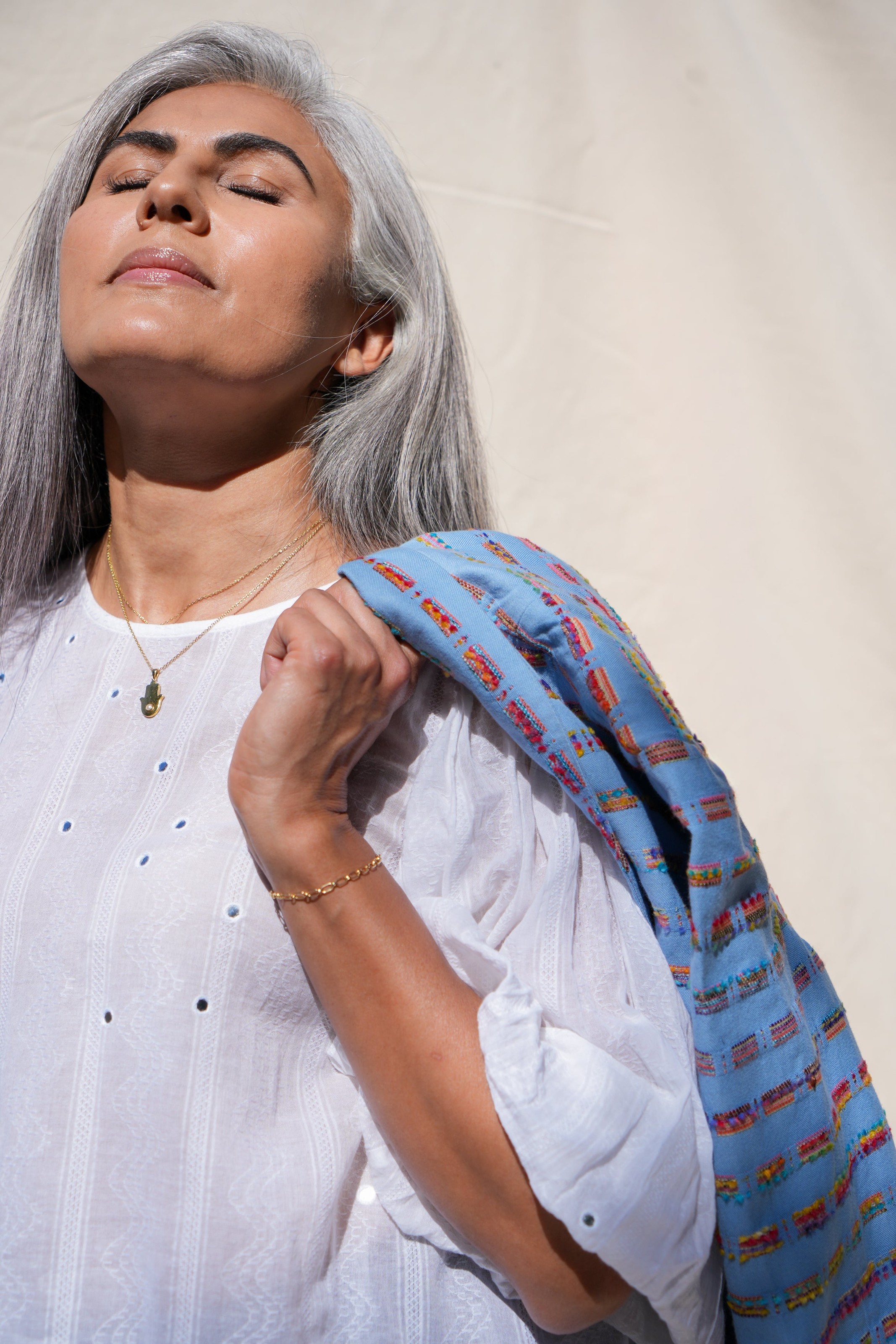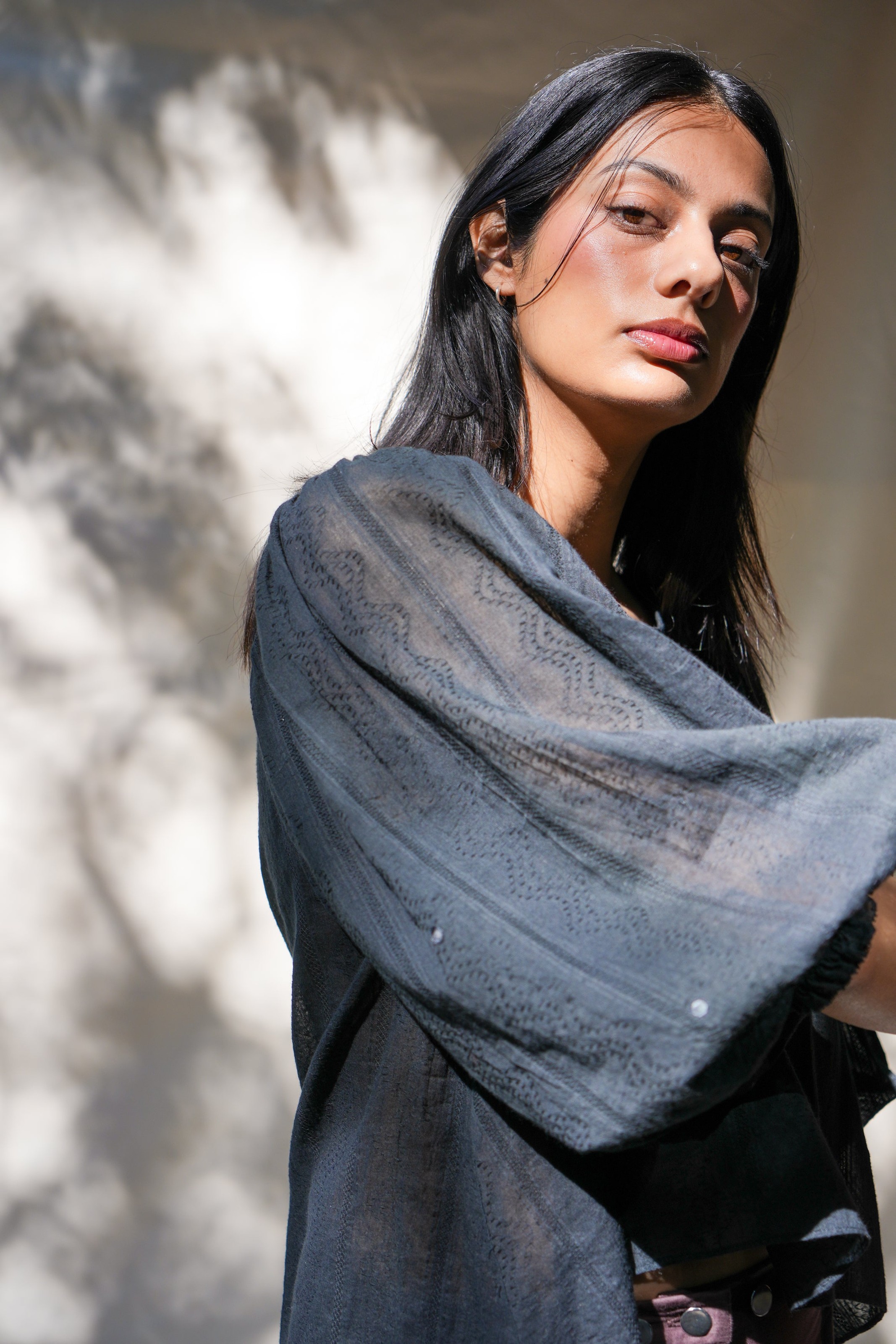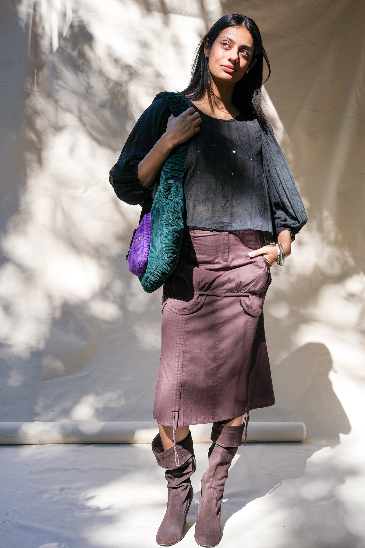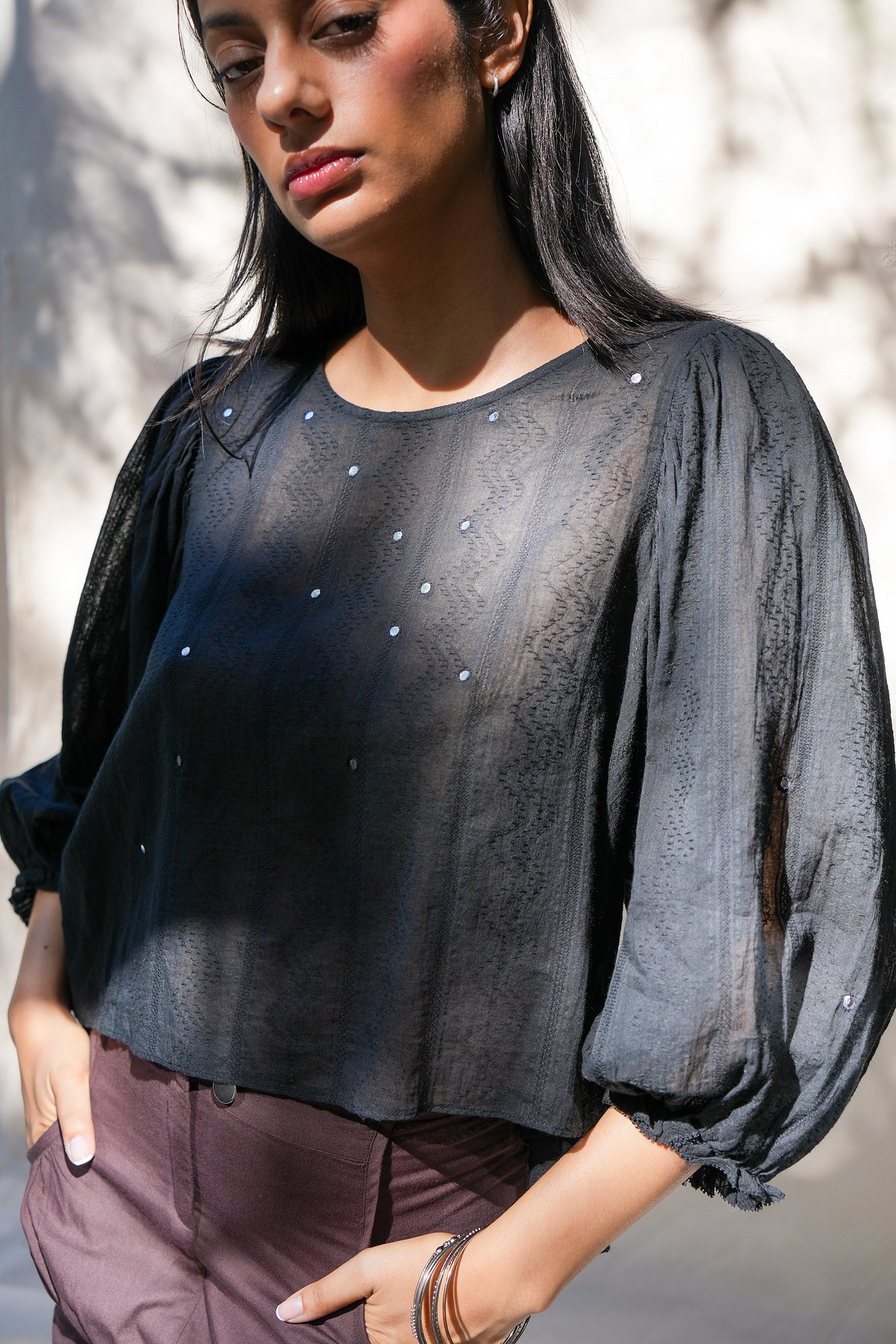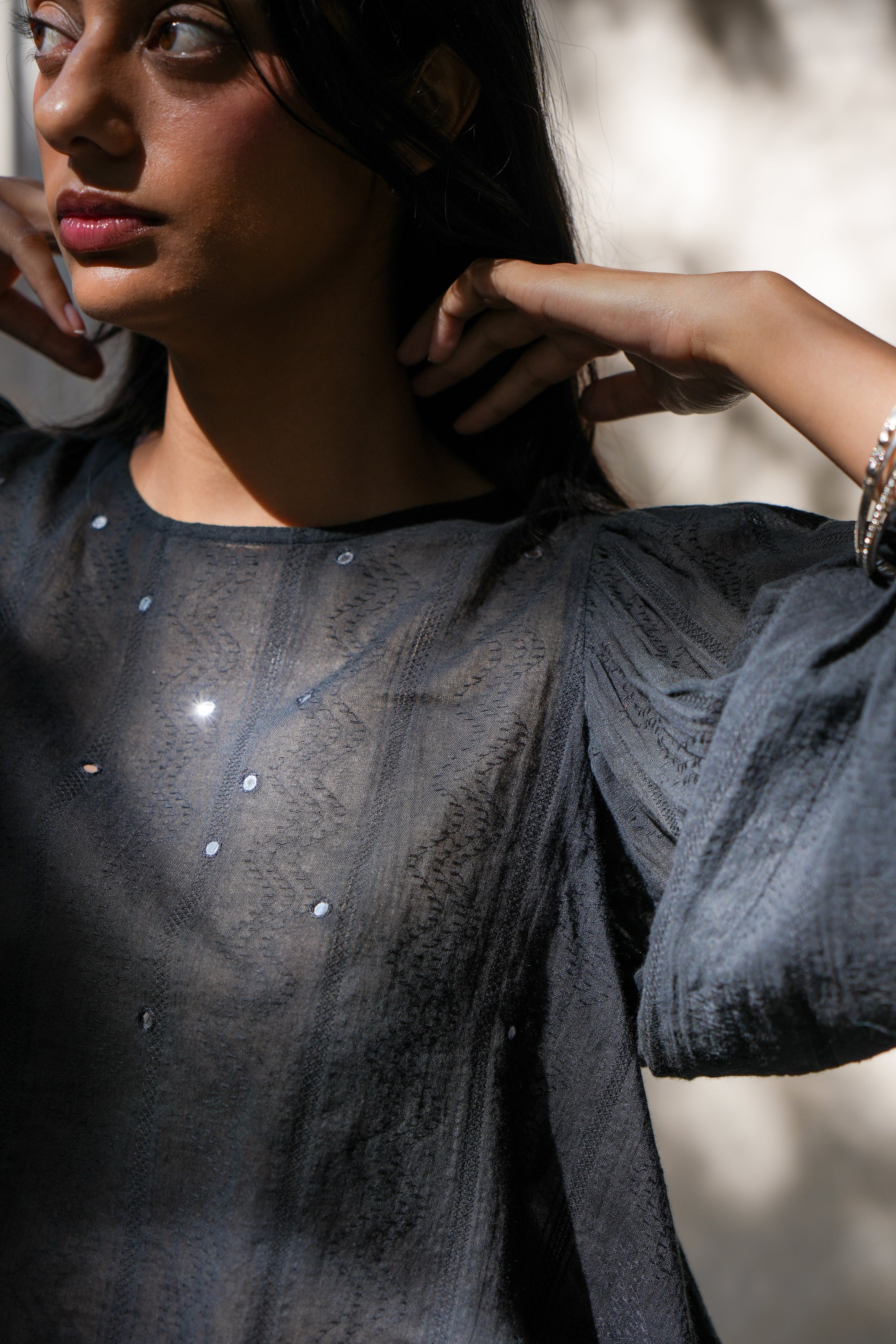 Mango colored top with textured lace detail, and sprinkles of tiny “shisha” or mirror embroidery, and hand-beading across front and sleeves. Wide balloon-shaped sleeves have an elasticized opening. Keyhole closure with small button at back neck.