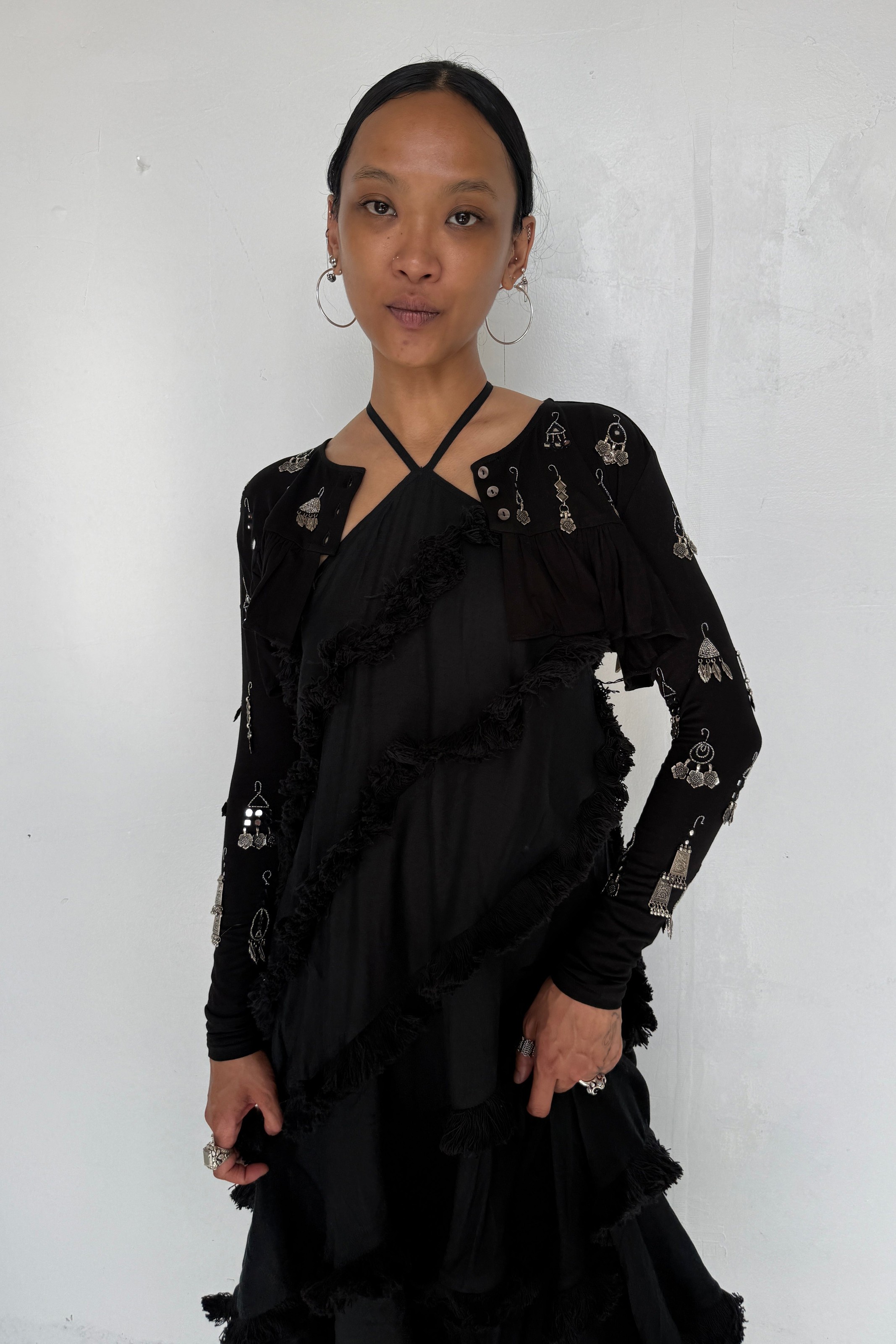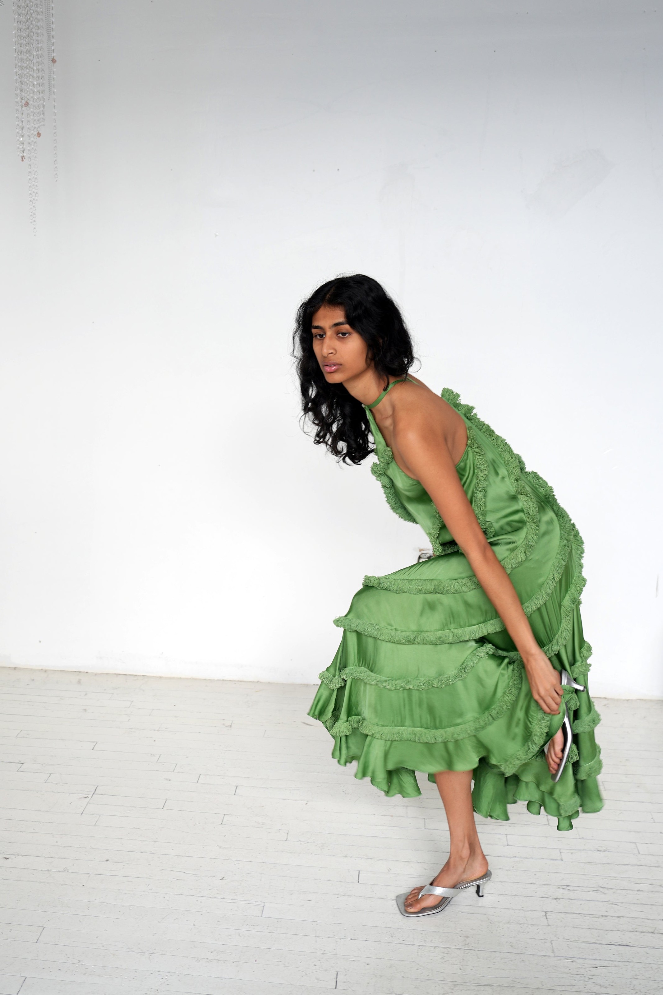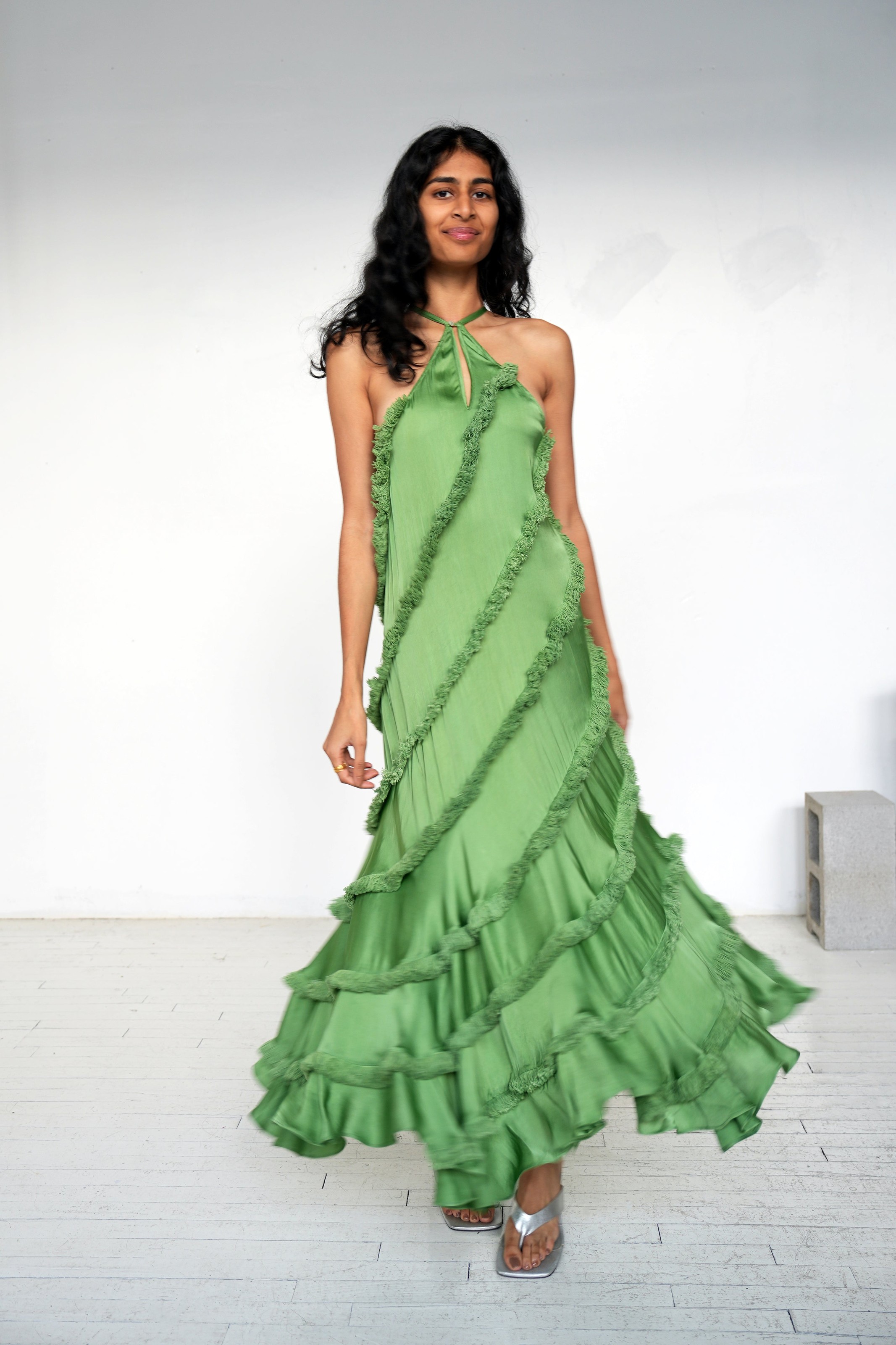 The green dress is made in vegan satin silk cupro, while the black one comes in a cotton/linen blend. Both have 100% cotton fringe trim and a natural shell button. Wear the keyhole opening at the back, or the front if you prefer.