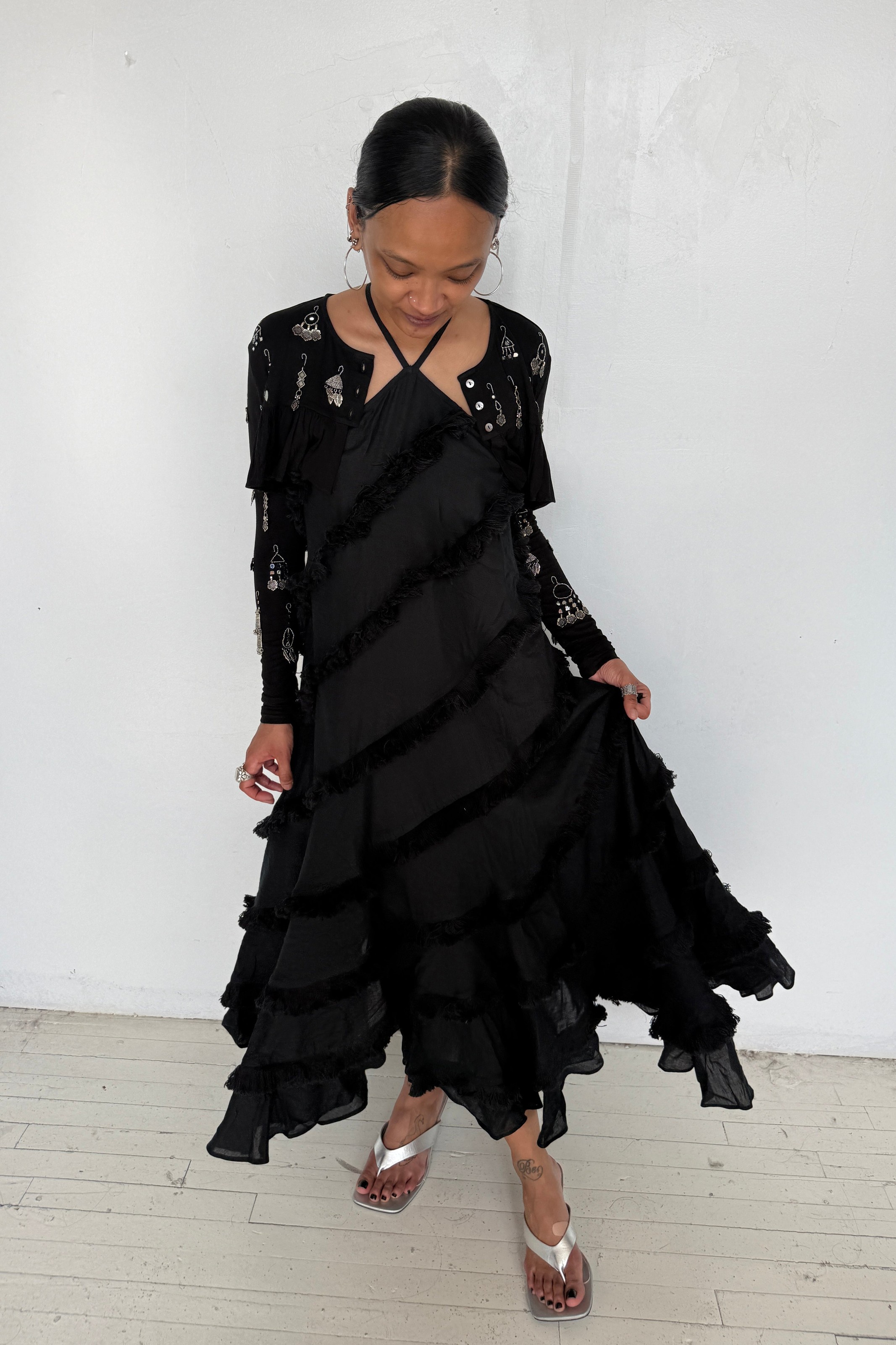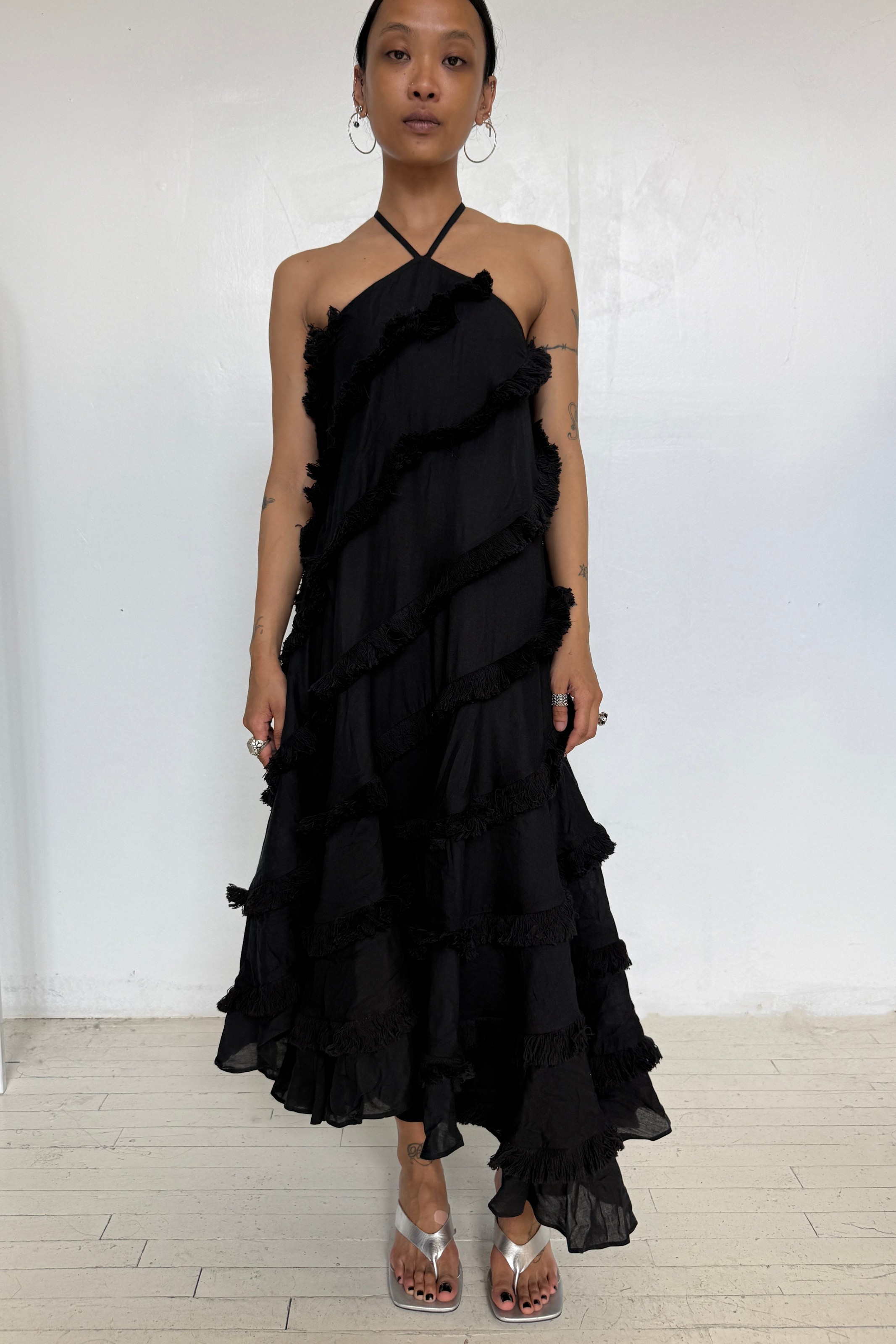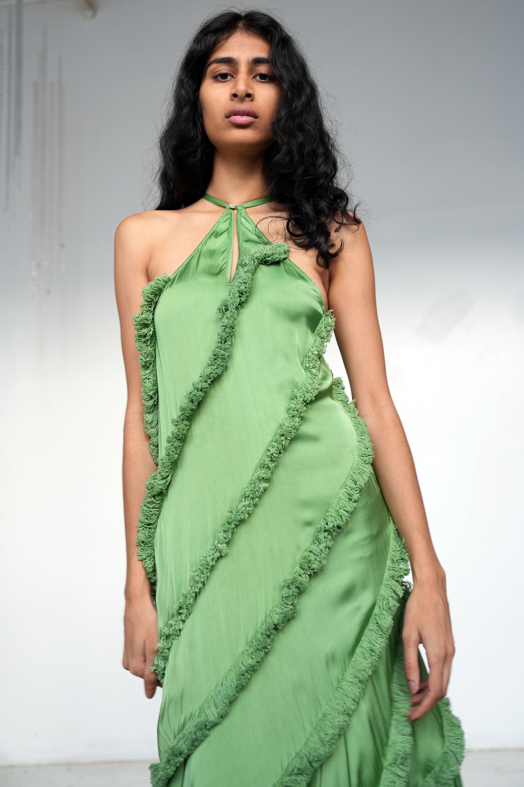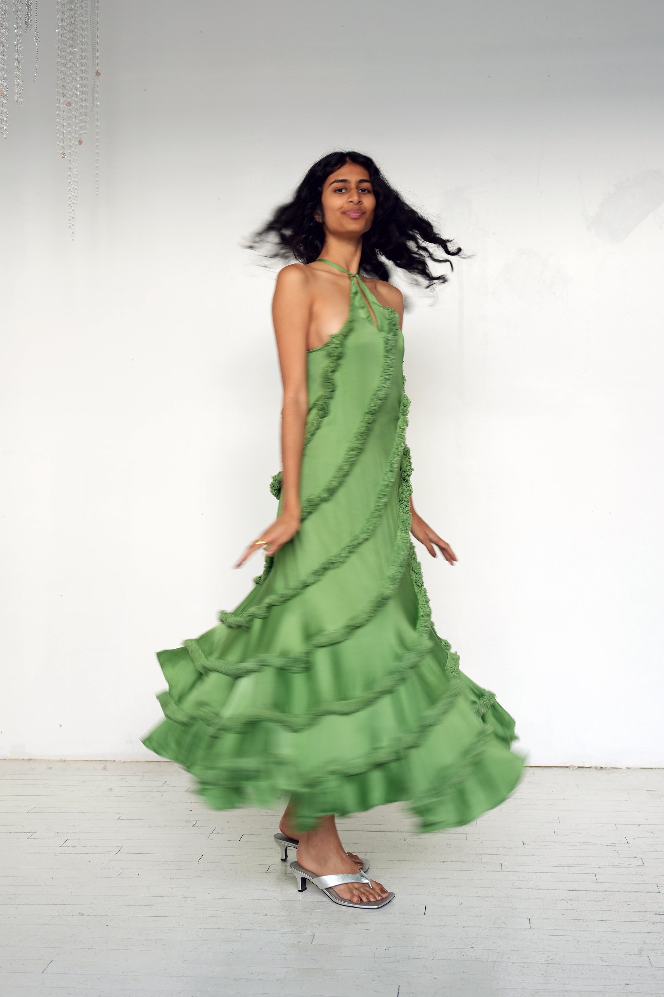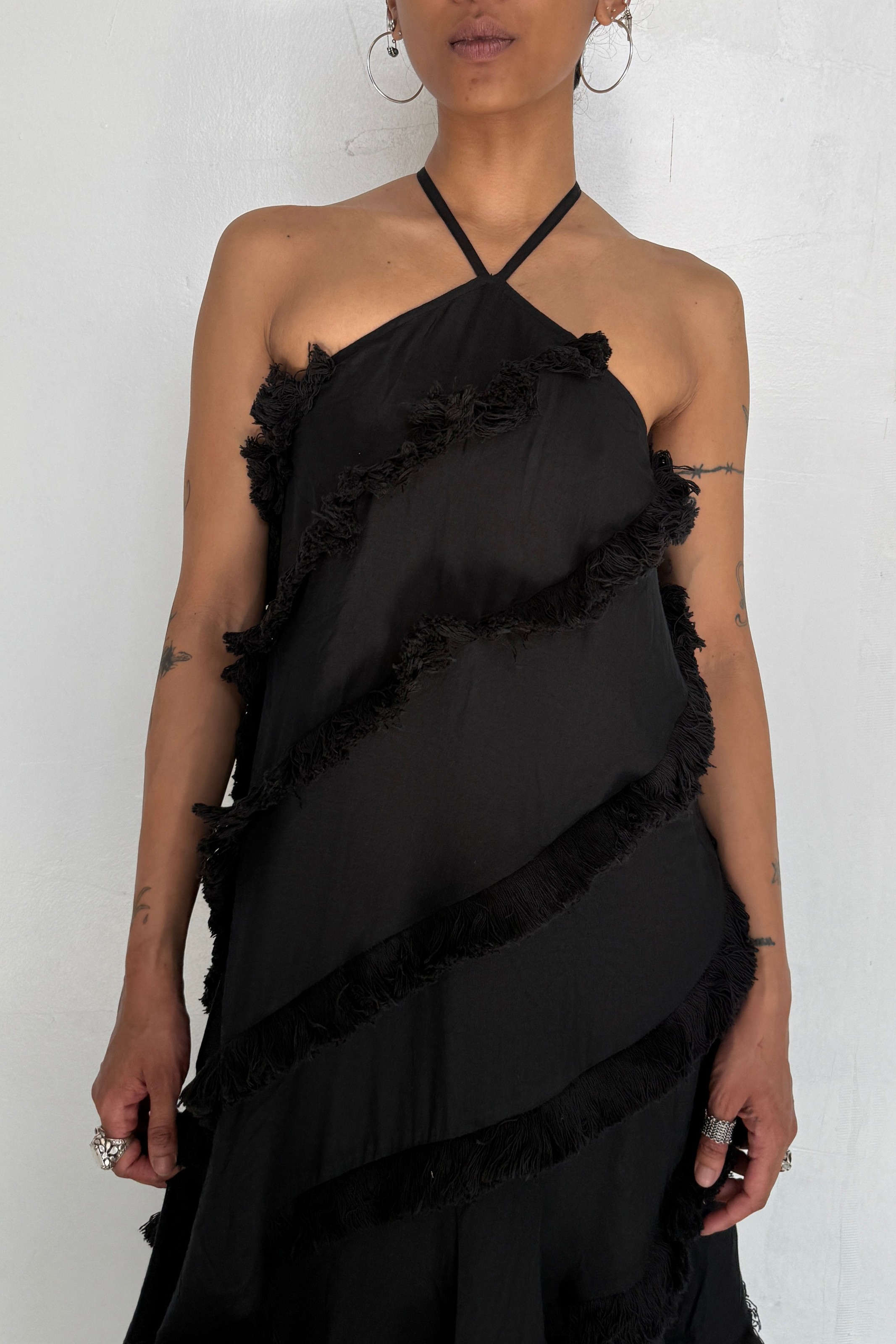 The spiral seam details and the fluffy fringe allover this dress make it the dress of the season. Perfect for events and wedding guest attire.