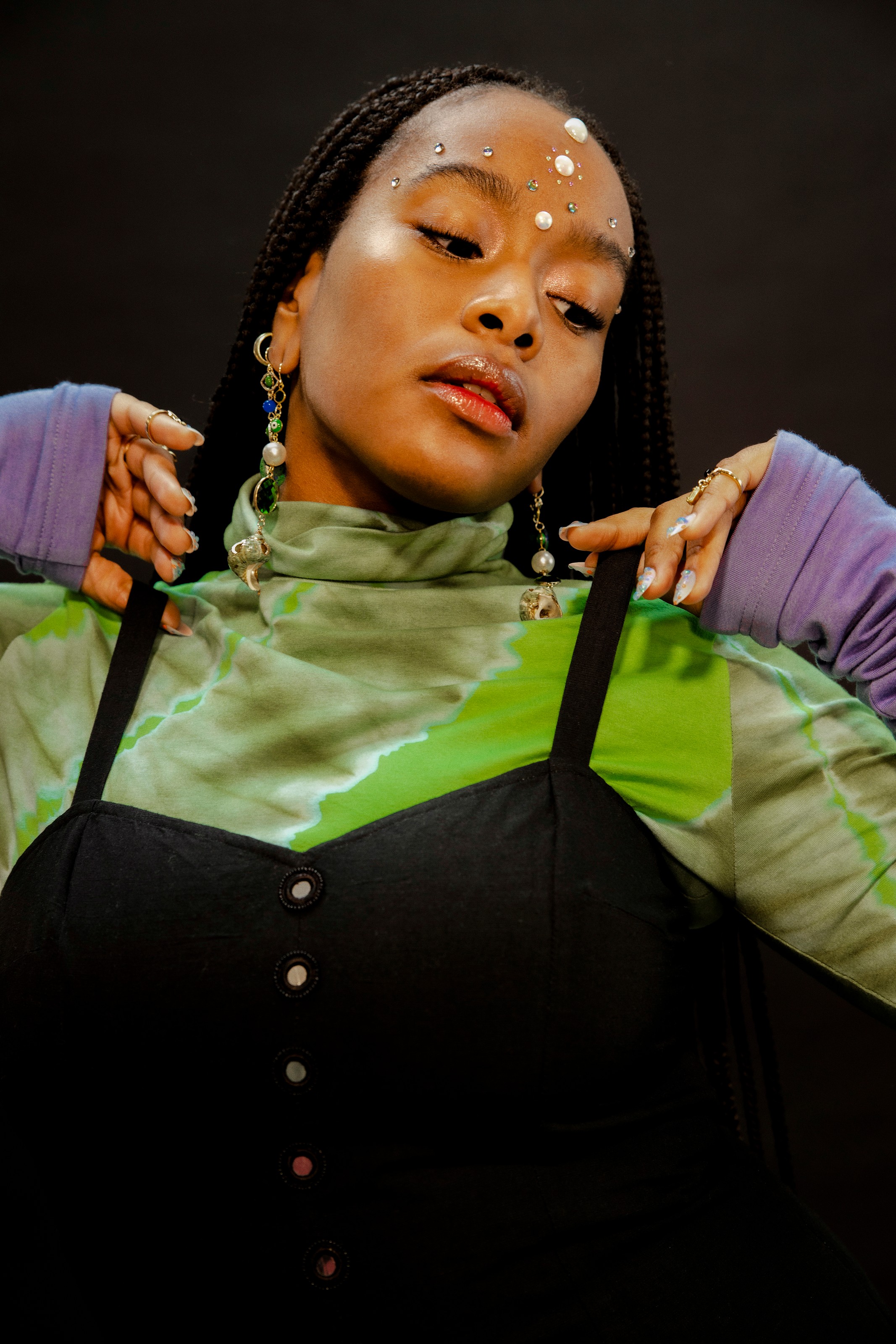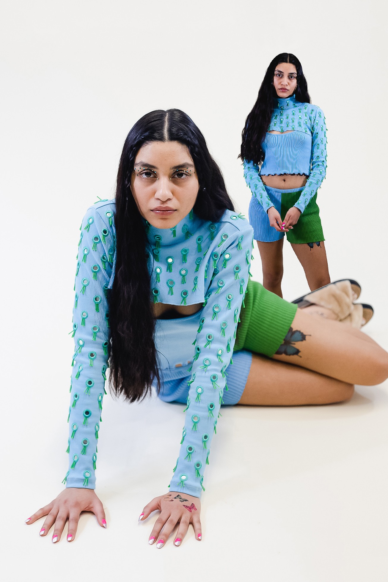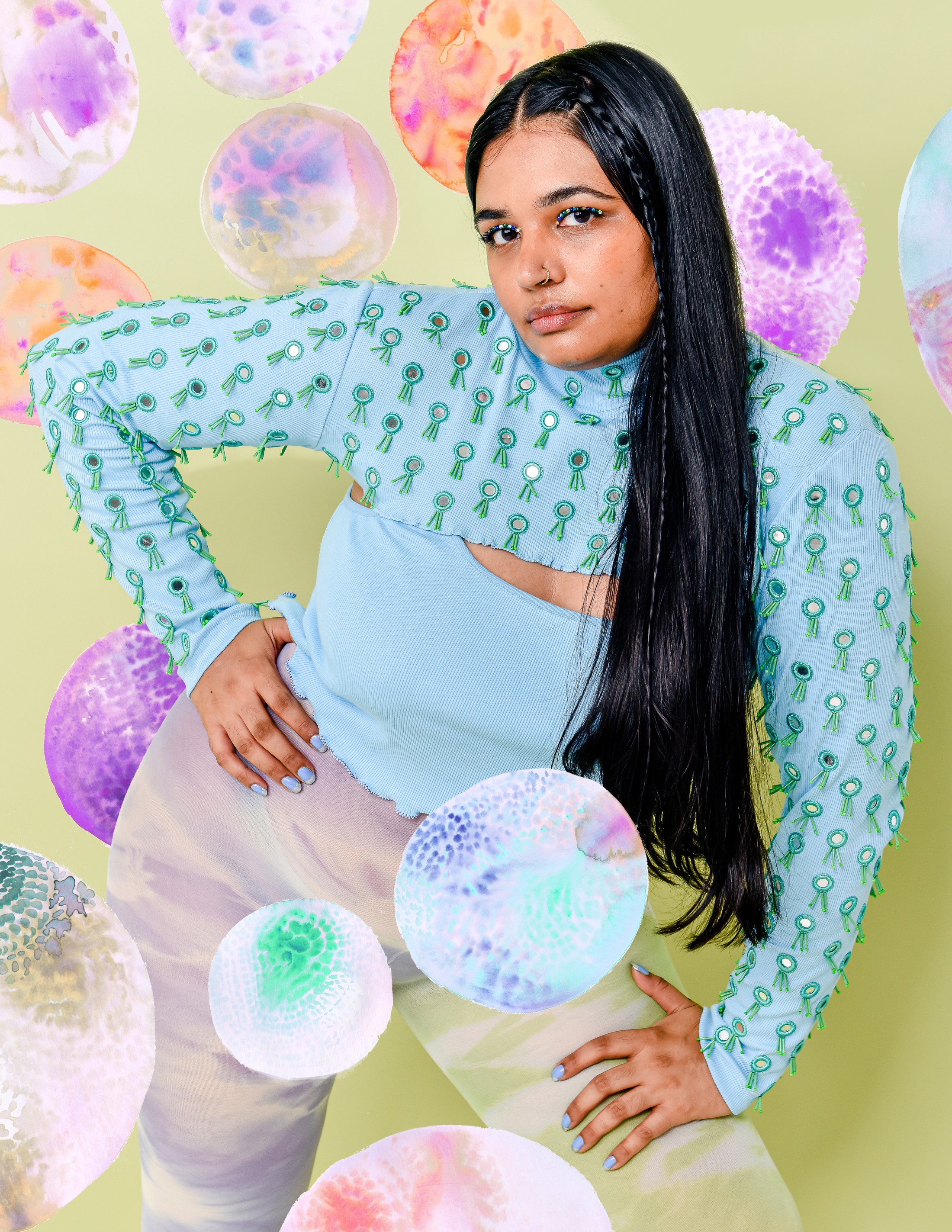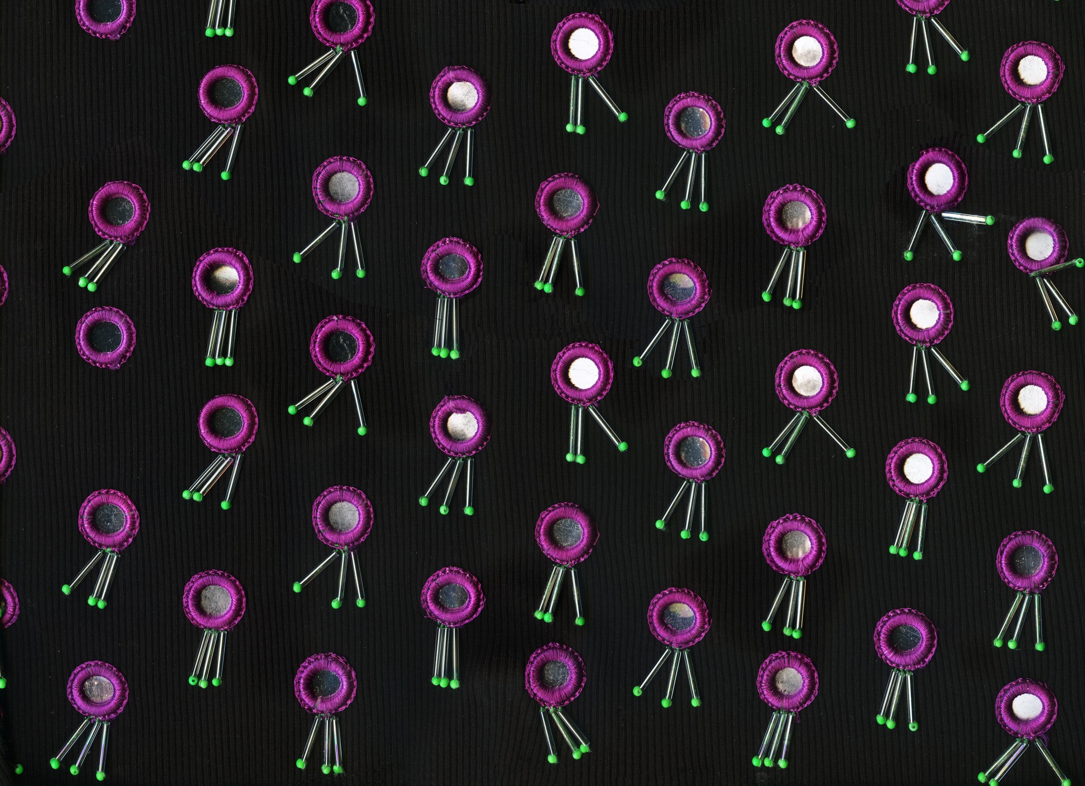 My new take on this technique has been to do it on a wearable knit fabric with some stretch, and add hanging bugle beads for a 3D fringe effect.